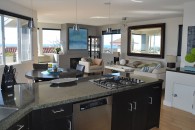 The third floor has a luxurious, fully equipped kitchen with granite counter tops and new stainless steel appliances. This kitchen has a refrigerator, stove, dishwasher, mircowave, and plenty of cabinet space. The kitchen over looks a stunning living room and dining room area that has ocean views. There is also a great room to relax and unwind from a day from the beach with friends and family.